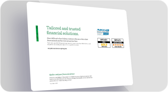 Tailored and trusted financial solutions. Since 1979, weve been helping customers like you achieve their financial goals and live more prosperous lives. Thats why over 460,000 people have chosen to invest more than 68bn * with us and why weve consistently won awards for our gold star service. Quilter and your financial adviser At Quilter, we believe in the power of professional advice. Thats why we work with financial advisers like yours, so that you can enjoy the benefits of a tailored service powered by our market-leading platform. * As at 30 June 2021 We pride ourselves on giving you: B+ PLA TFORM SECTOR VERY STRONG QU ILTER INVESTMENT PLATFORM LIMITED ISSUED: 06/01/2021